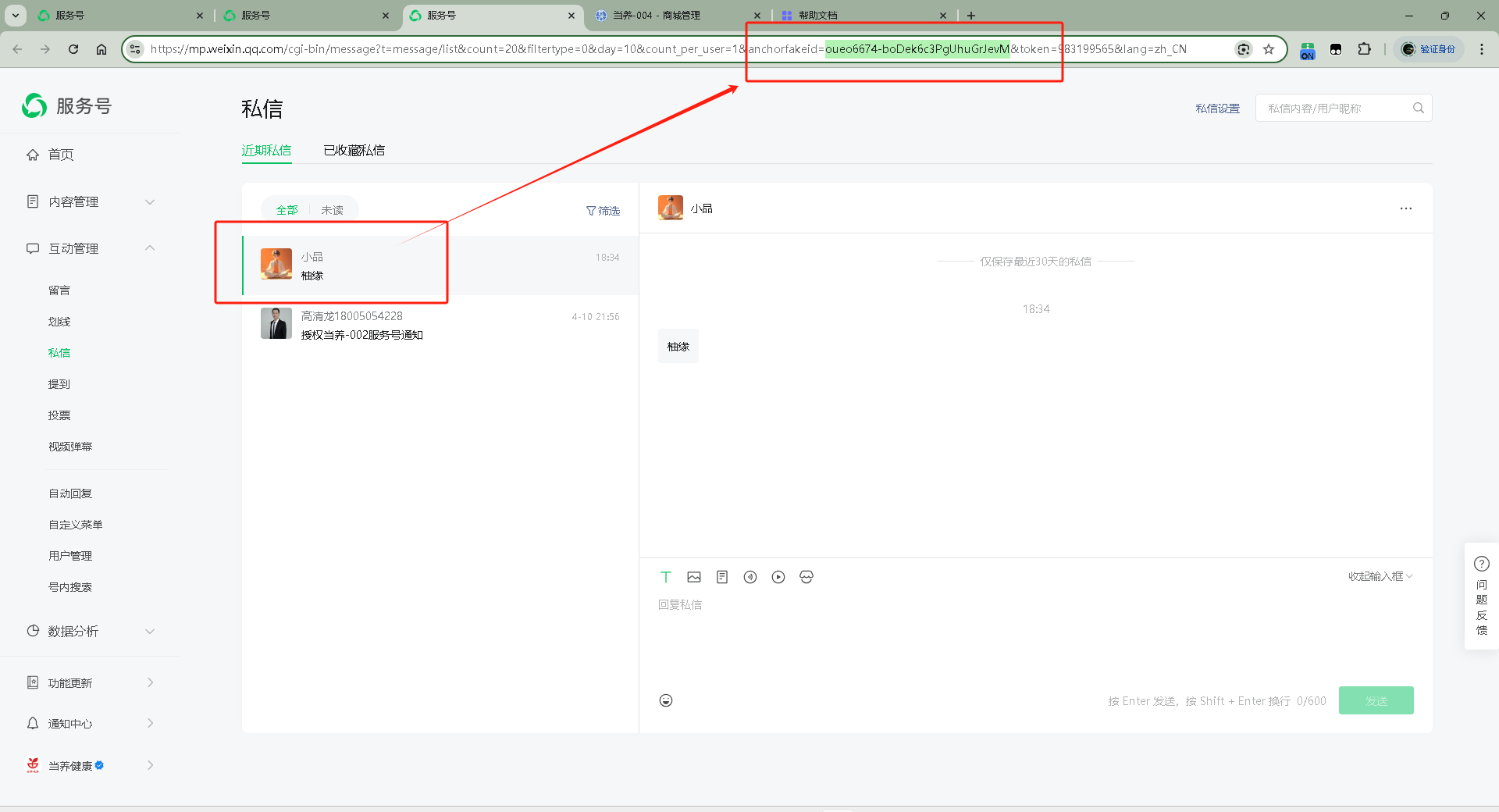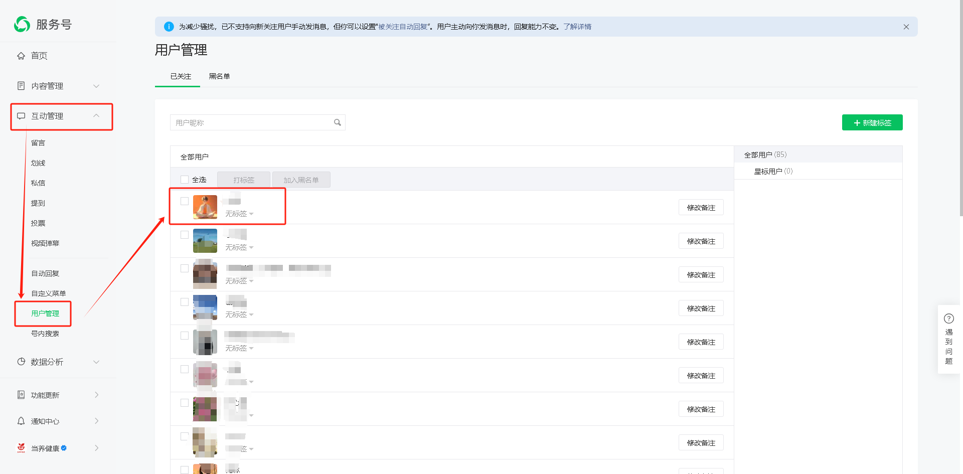 3、找到刚刚关注公众号的用户:互动管理--用户管理:点击头像,不要直接在私信里面找