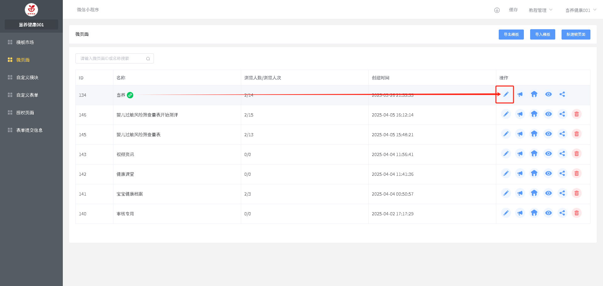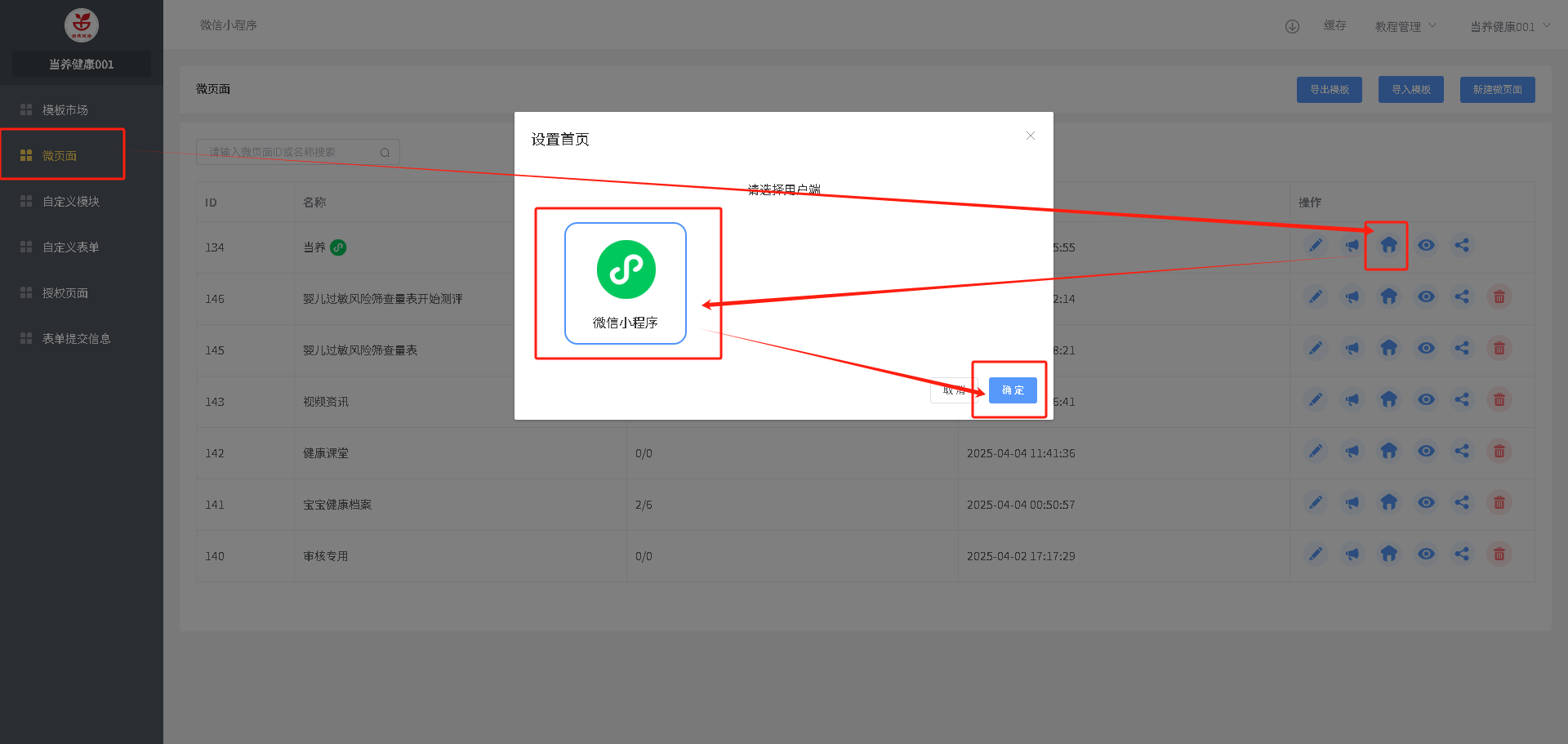 带小程序图标的即小程序的首页【通过右边操作点击”房子“图标设置为小程序首页】,点击”铅笔“图标进入编辑页面