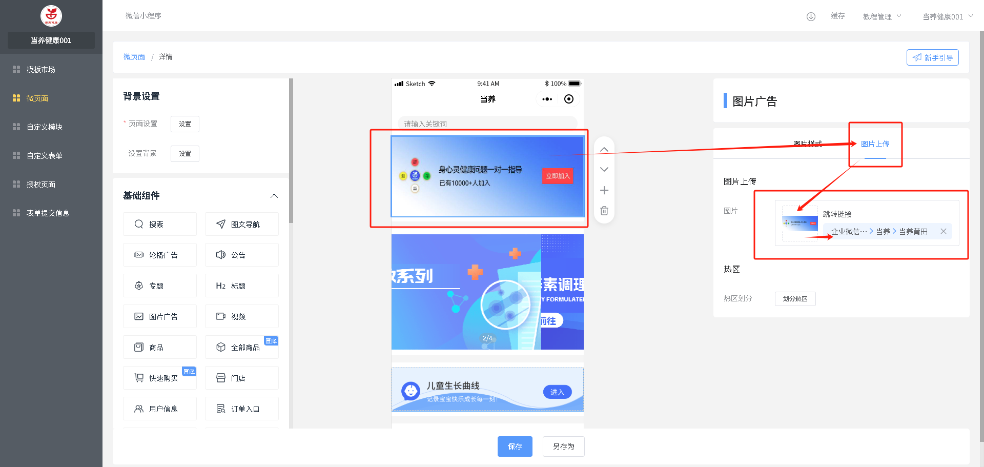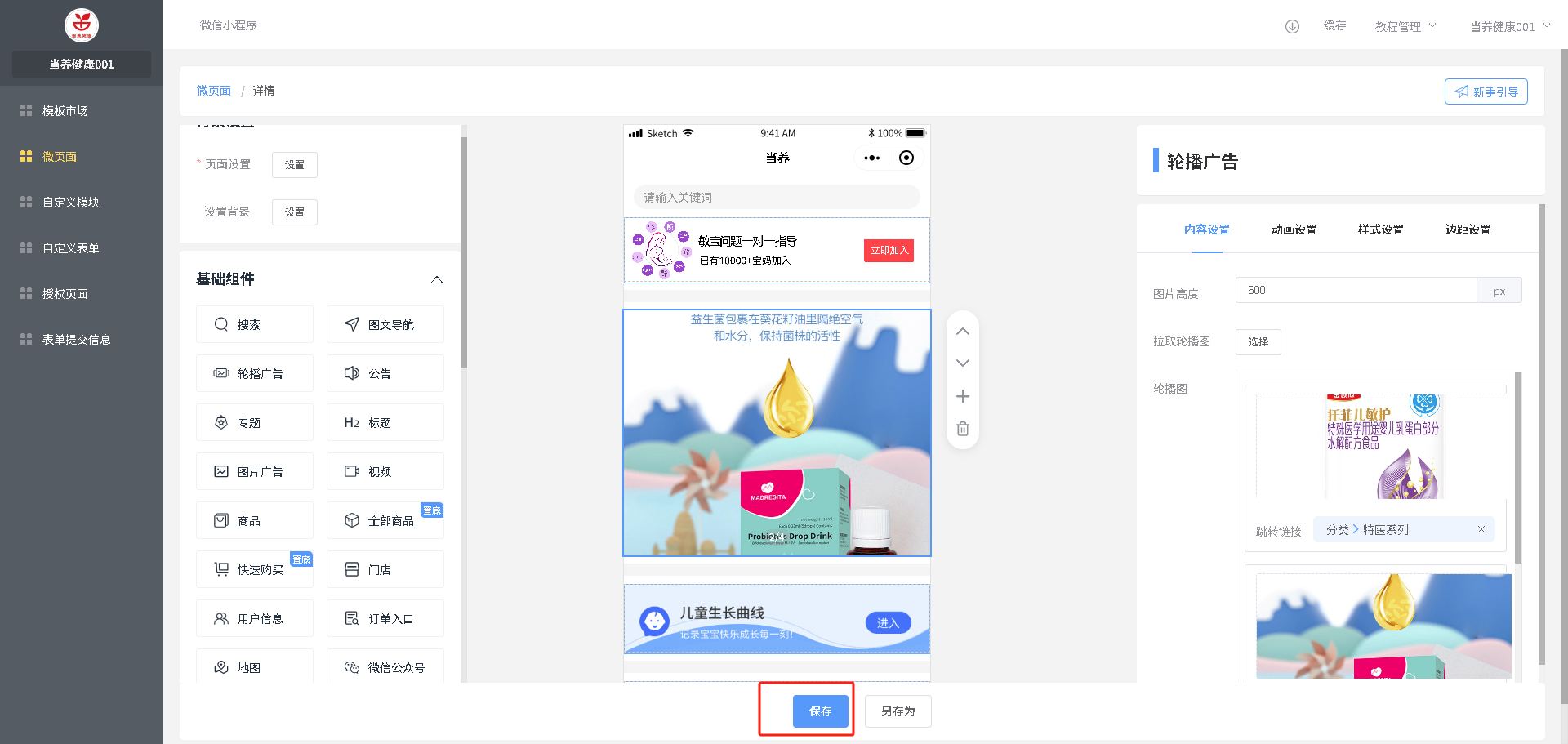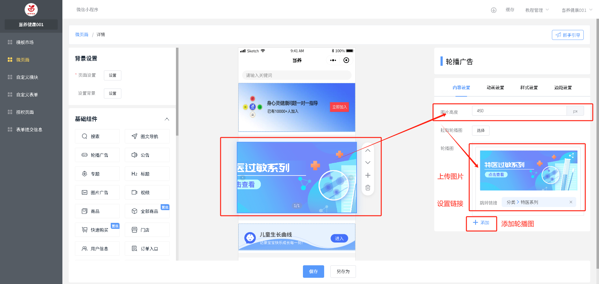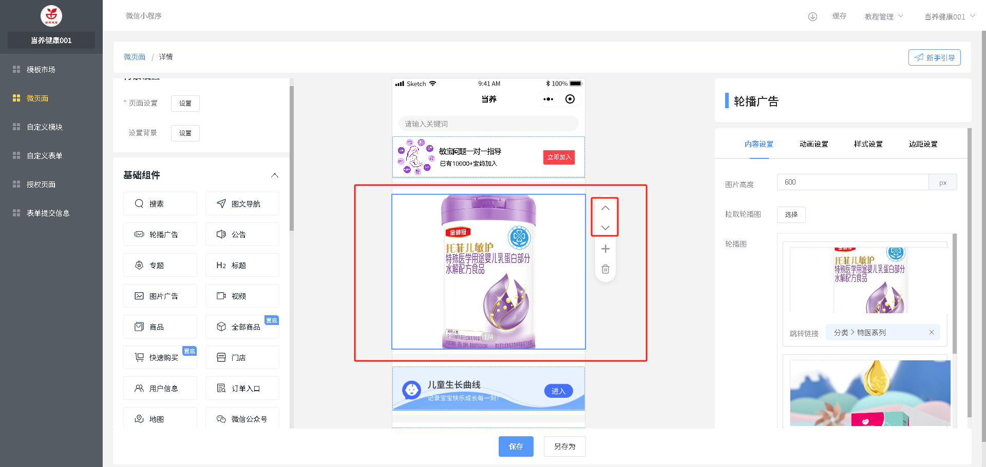 轮播图广告:尺寸说明(1、每张图尺寸/比例要一致,2、宽度固定750px,3、高度根据右侧自己设置的来设计图片)