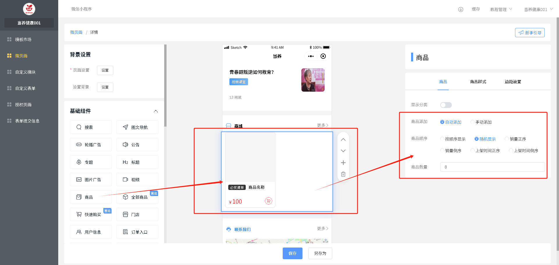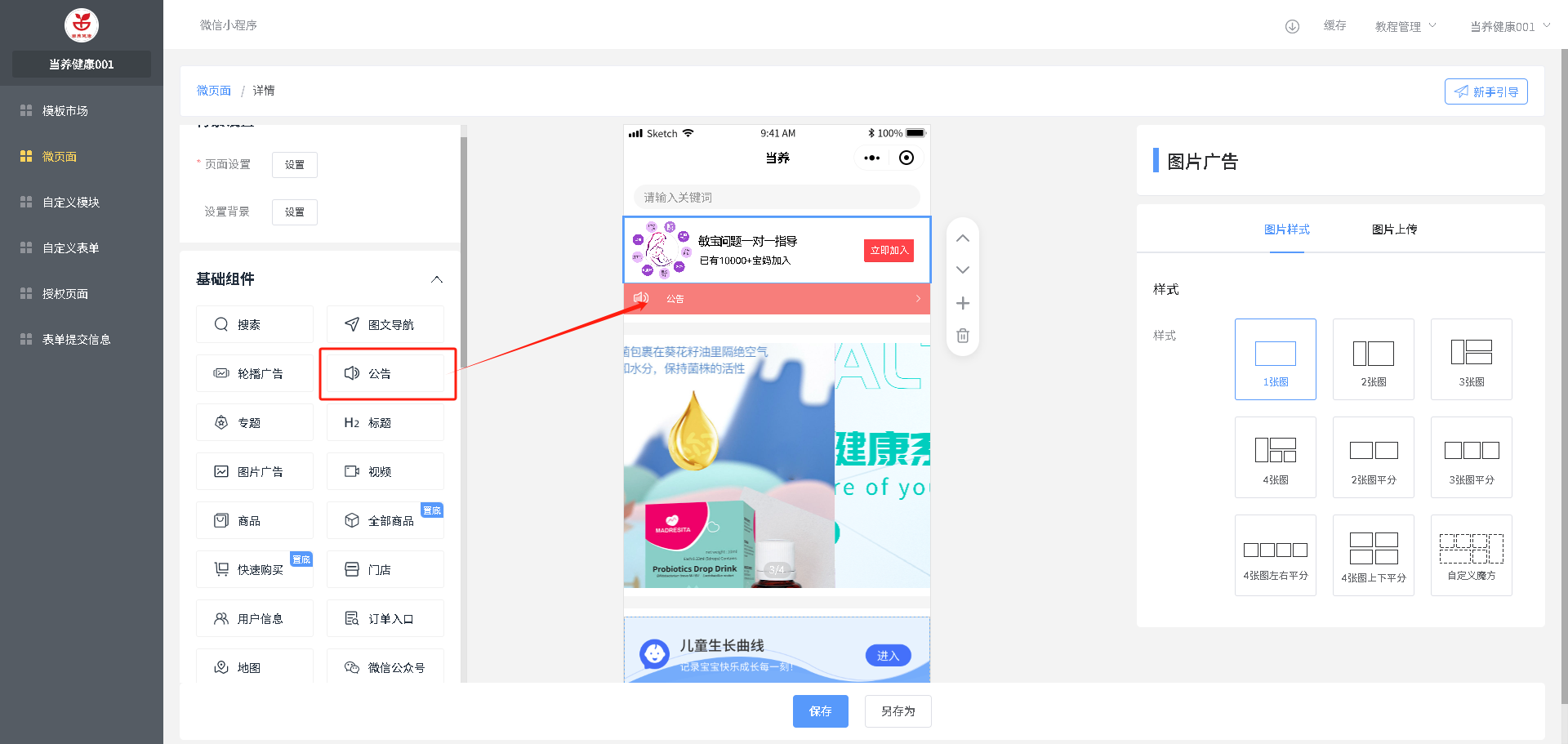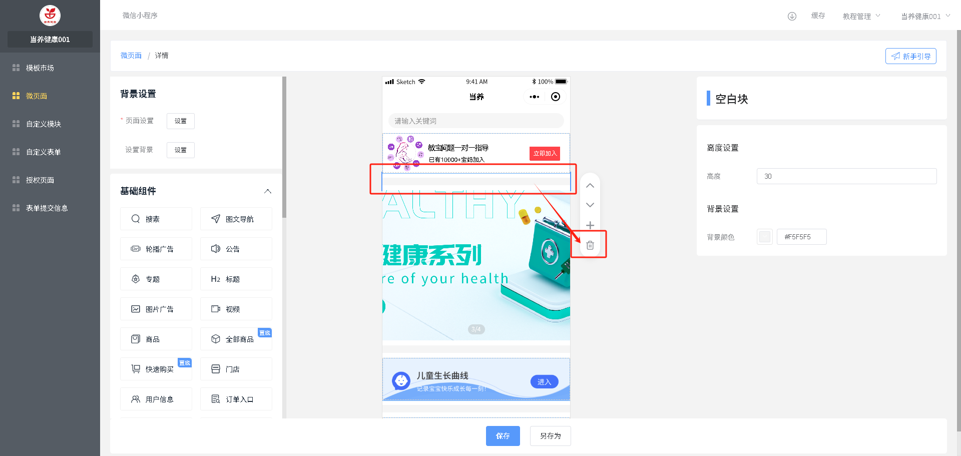 增加组件:在需要加入的位置,选中上面一个组件,点击左侧要加入的组件,自动加入到页面选中组件的下面