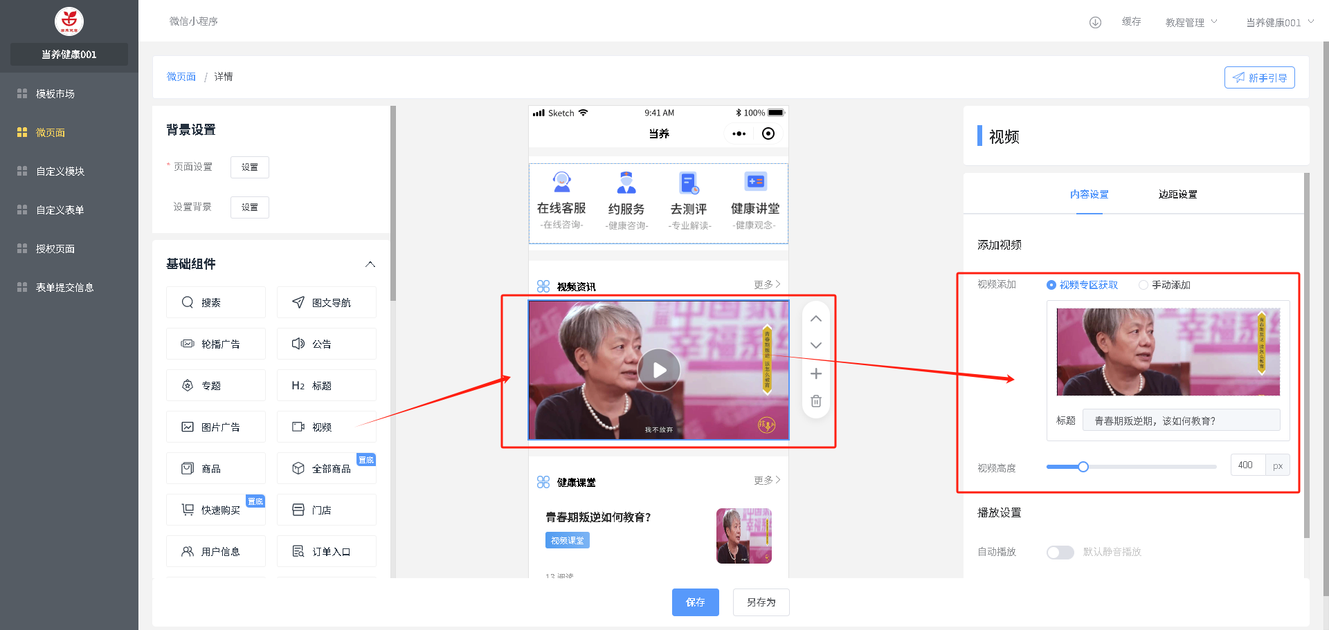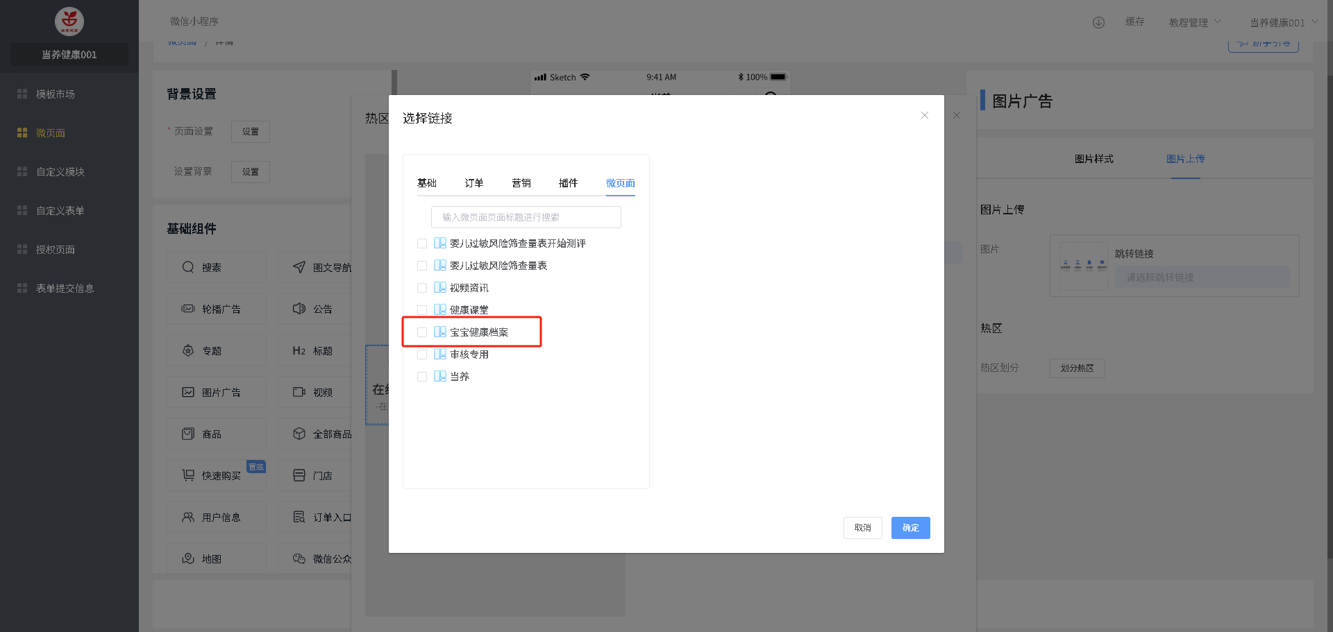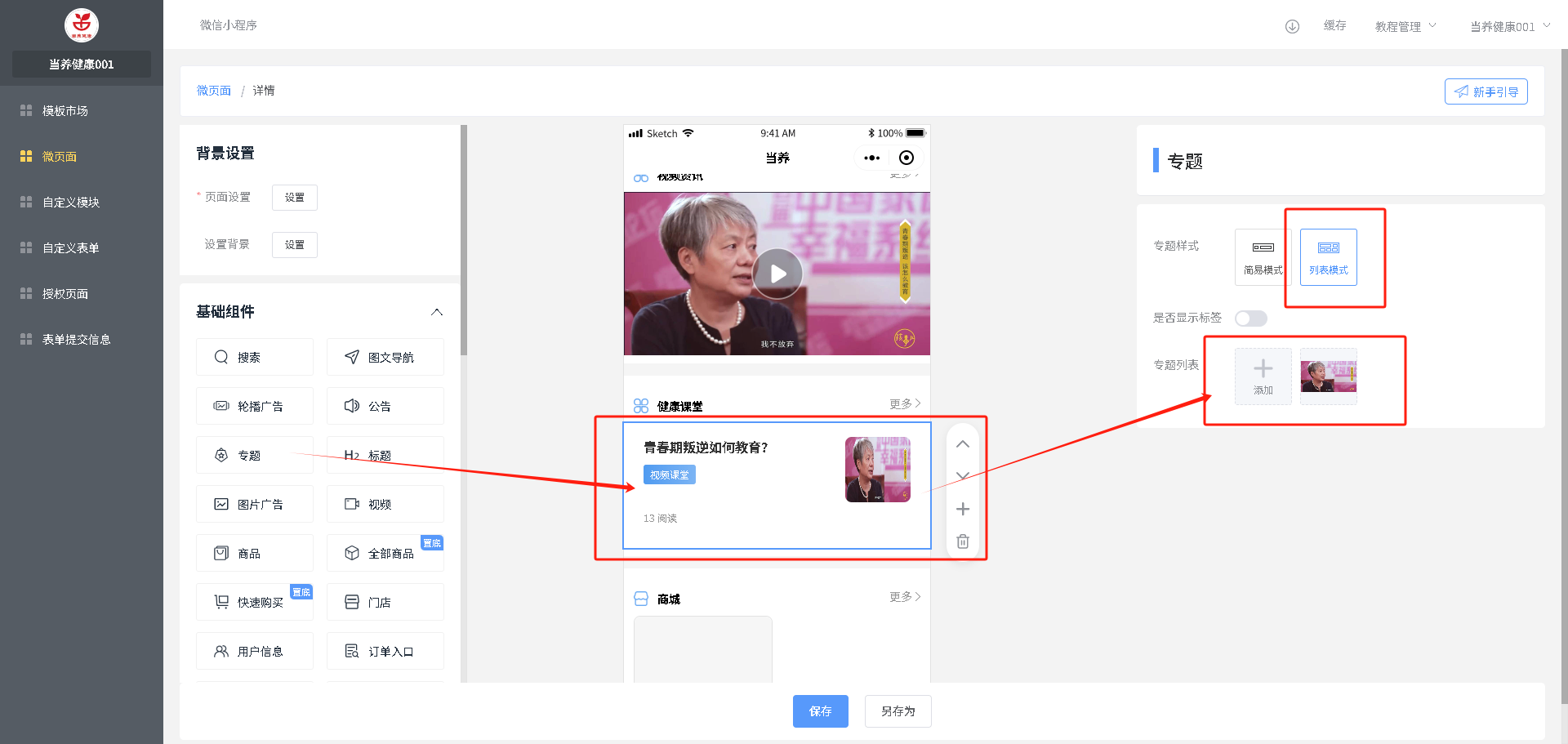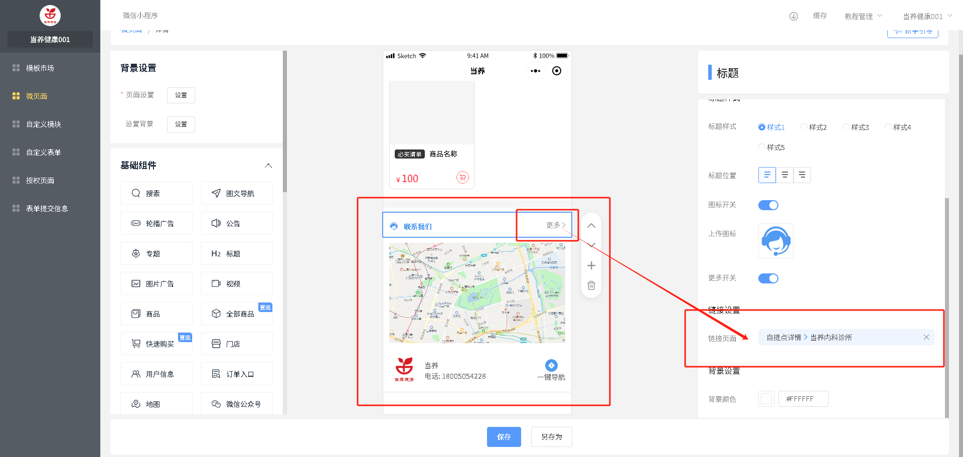 增加组件:在需要加入的位置,选中上面一个组件,点击左侧要加入的组件,自动加入到页面选中组件的下面