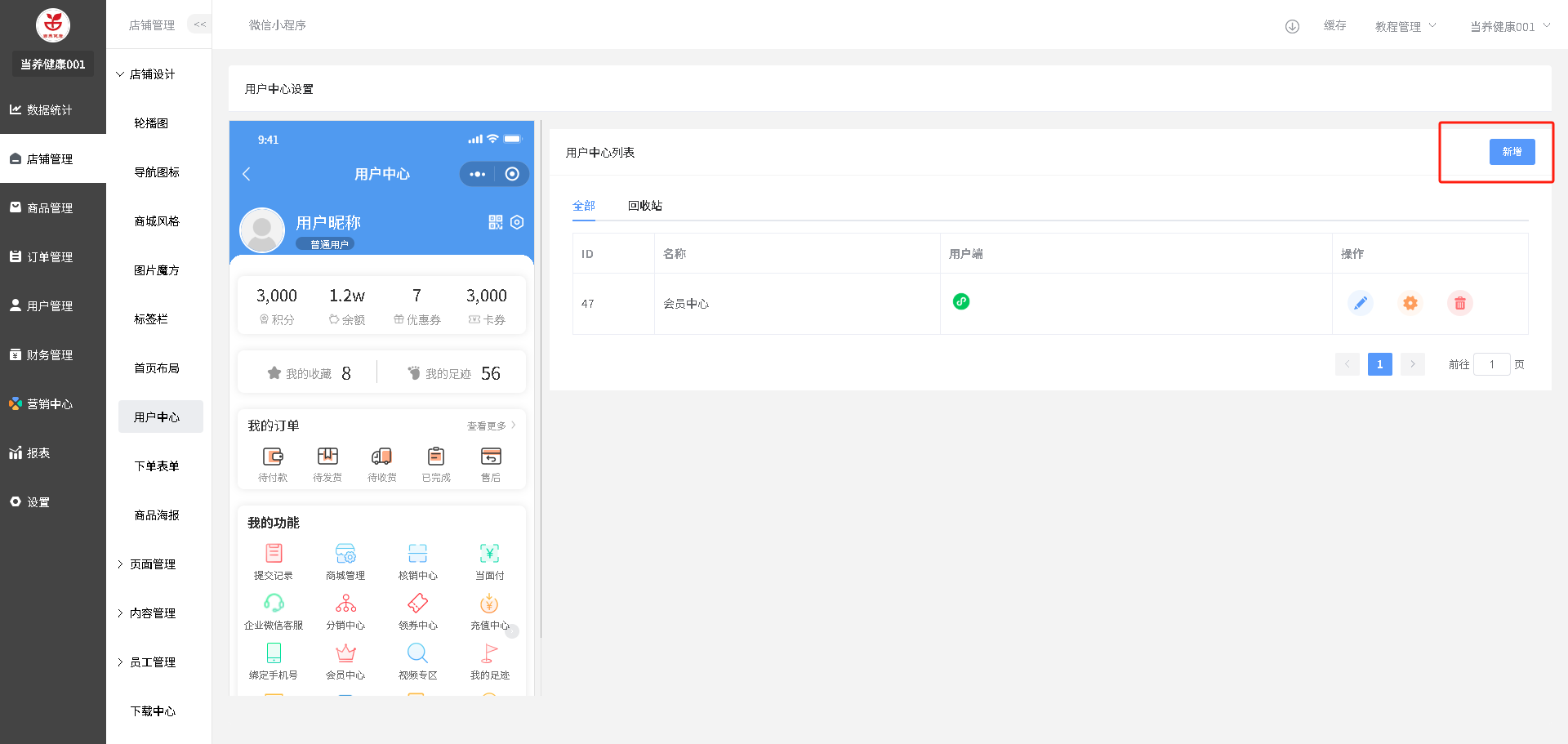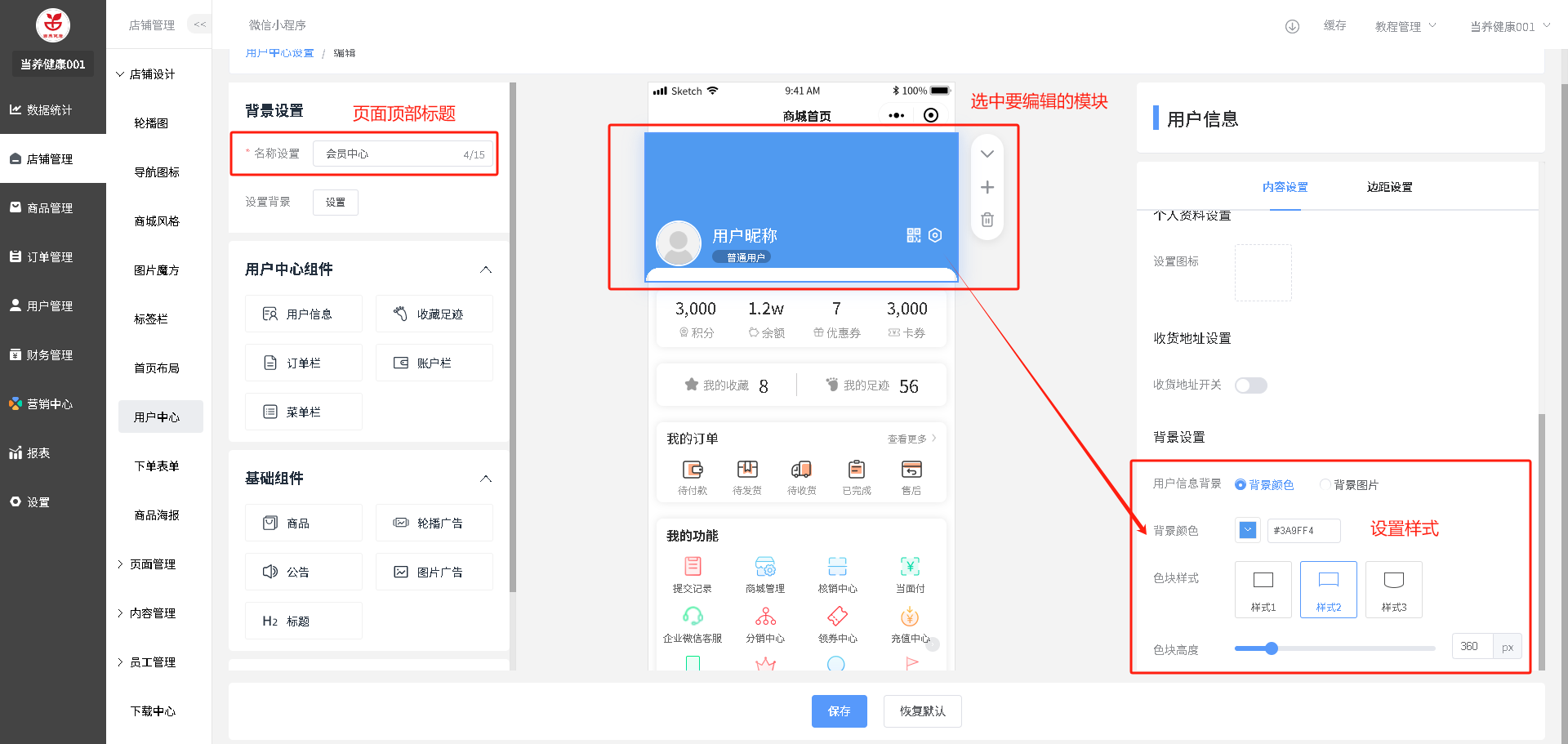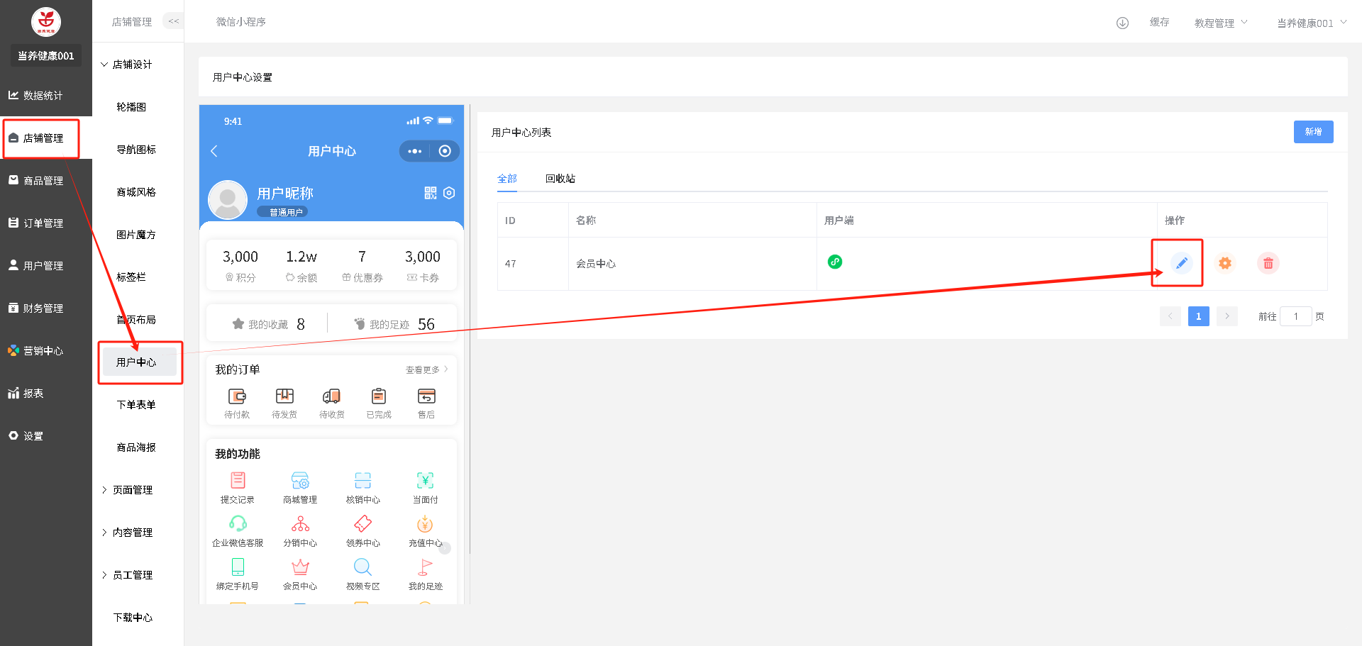 装修路径:店铺管理--用户中心--点击”编辑“图标操作