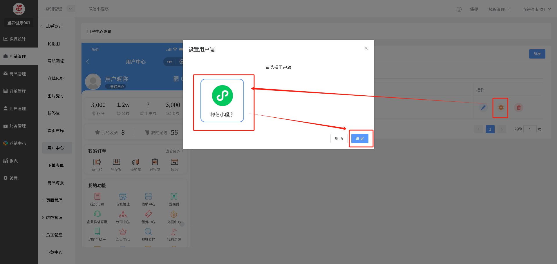 设置成用户中心页面:点击”设置“图标,选择小程序,确定即可,只需要设置一次即可,或者新增了新的页面,需要把新的页面设置用户中心页面才需要这个操作