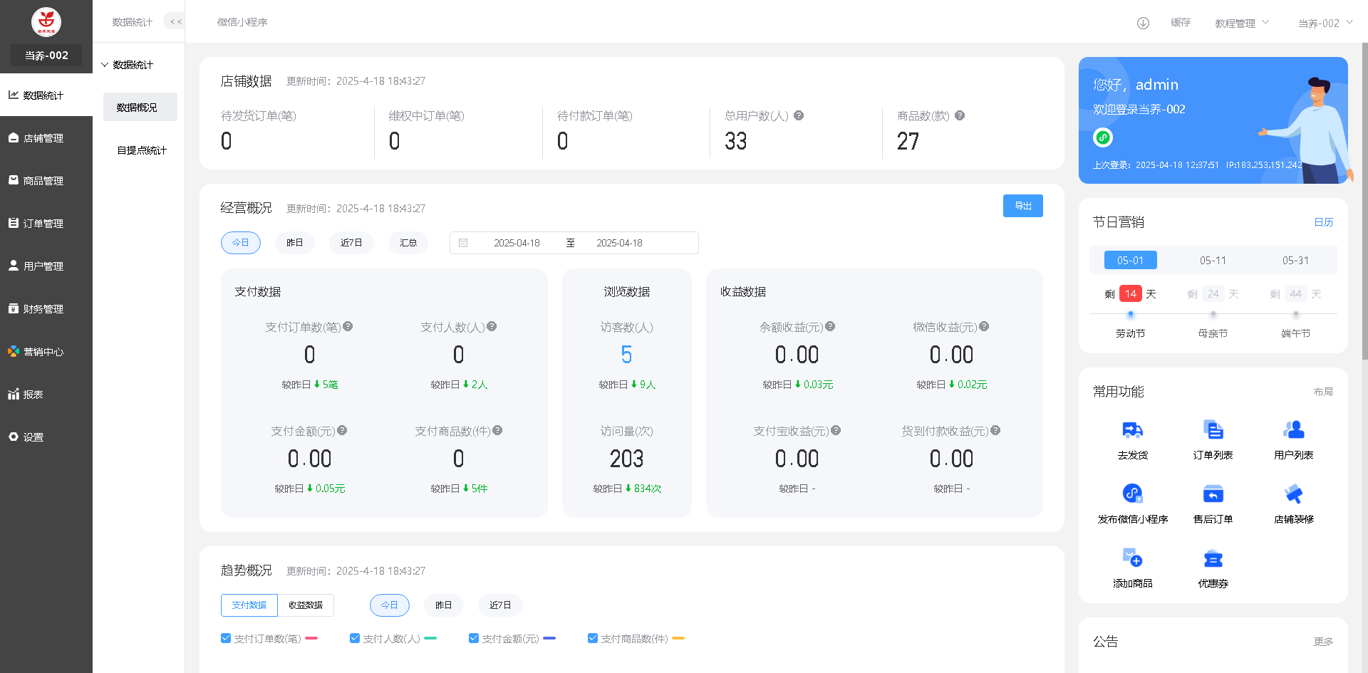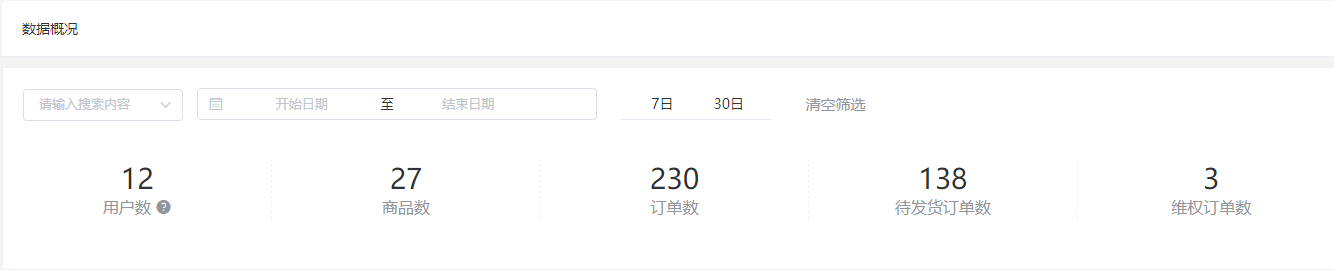 支持选择不同的店铺查看用户数(统计全平台用户数,不随店铺的更改而更改)、商品数、订单数、待发货订单数、维权订单数(正在维权的订单数)