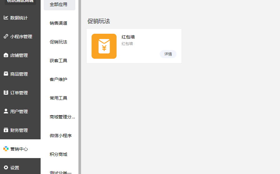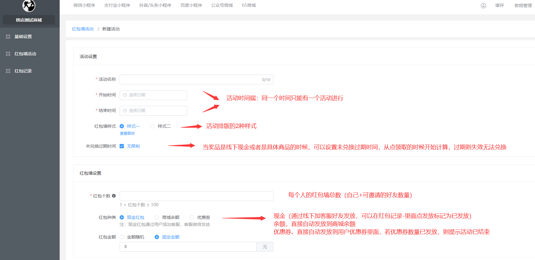 需要商城版本4.4.14及以上,需要小程序重新发布并且购买安装了红包墙插件才能使用