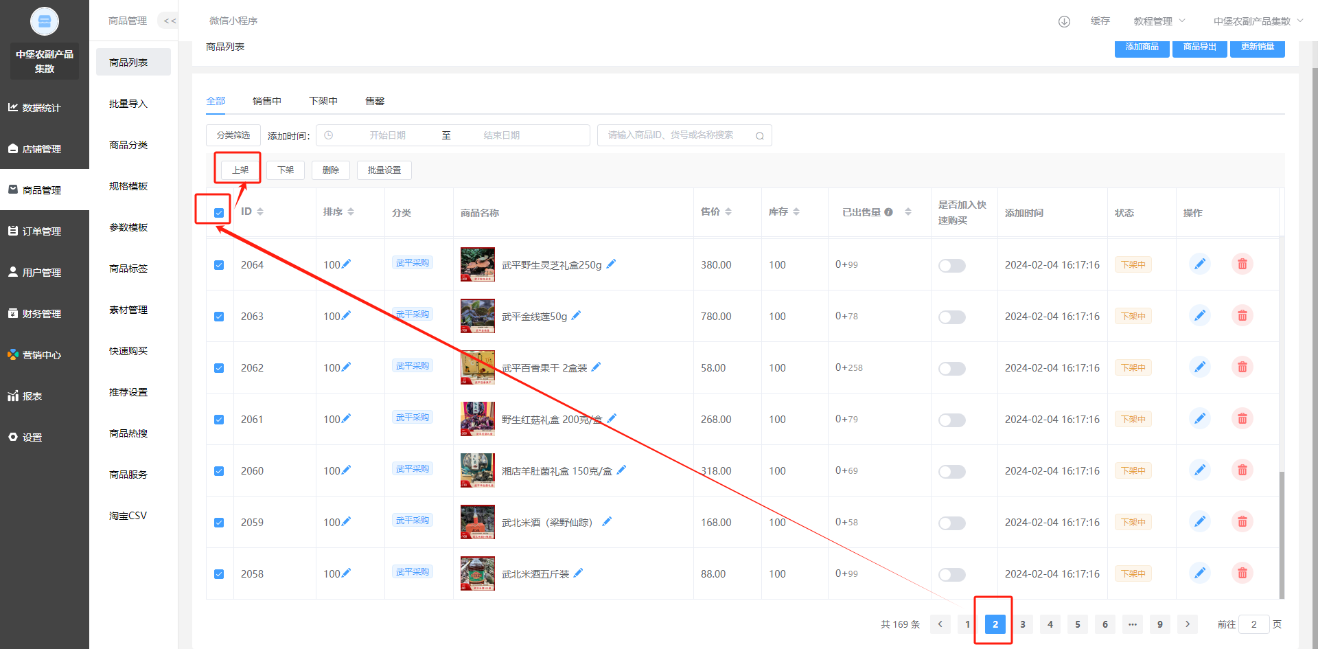 批量上架只支持当前页面的商品批量上架,其他页面需要点击分页后,同样上面操作即可