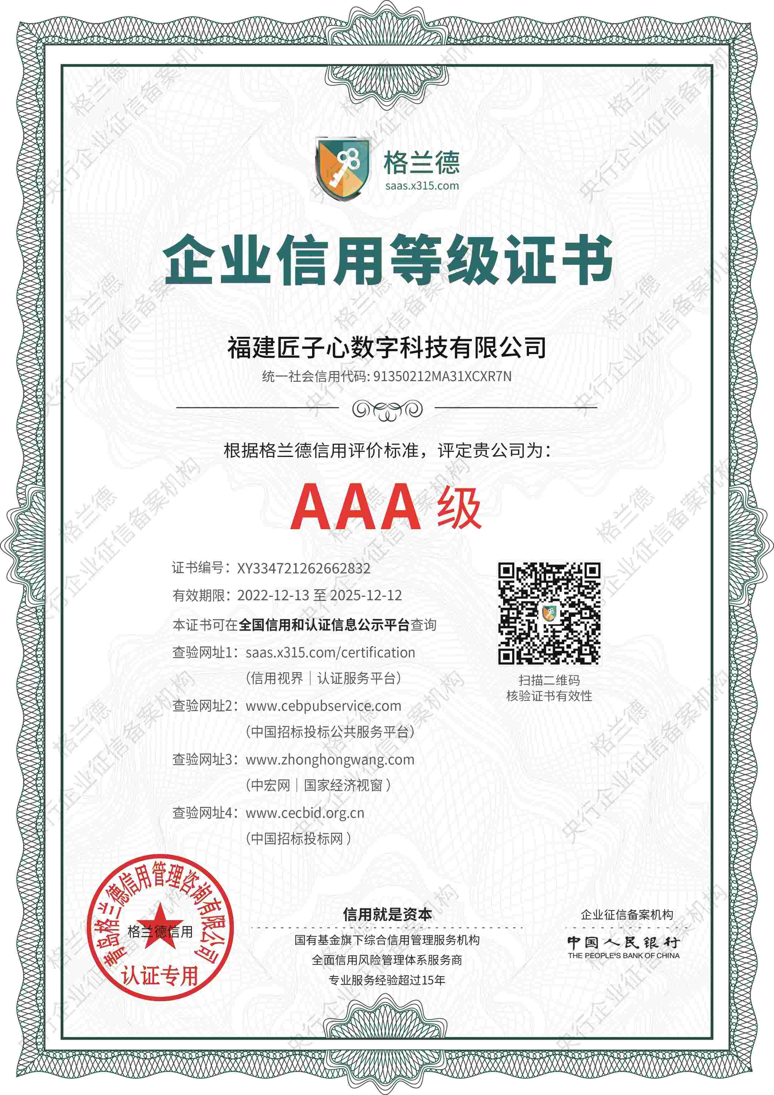 企业AAA信用等级证书